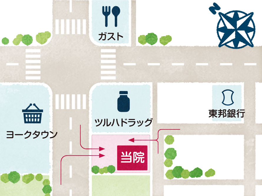 通院するお母さんの動線を考え、近くに買い物のできるスーパーがあることにこだわりました。また、車社会の中で、病気のお子さんを連れてくるお母さんたちが安心して駐車できる、広めの駐車場を確保。抜け道を作り、安心して行き来できるように、二方向からの駐車場利用ができるようにしました。