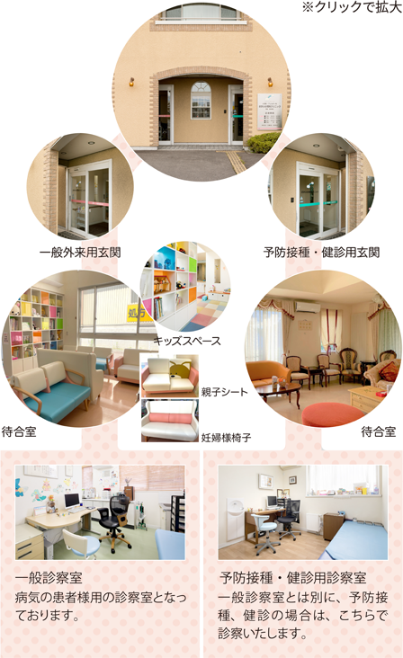 予防接種をする時、お子さんだけでなく、お母さんも不安です。元気なのに小児科へ行って、他の病気をうつされないだろうか、子どもの状態は大丈夫だろうか、など…。そしてその不安は、接種を受けるお子さんまで影響されます。そういった不安をなくすため、当院では予防接種と健診は、全く別の入口から入り、 まったく別の待合室でお待ちいただけるようにしました。